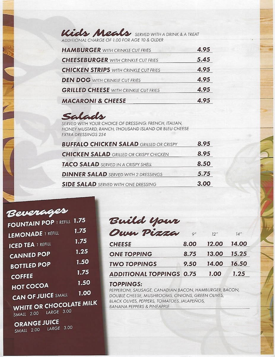 Drink aficionados will appreciate the ice-cold beer selection, expertly served by the friendly staff. The ambiance, enriched by welcoming owners Travis and Jamie, ensures that every visit feels like a warm reunion. Whether you're at a table or the bar, you’ll enjoy engaging conversations and a neighborly vibe that embodies small-town charm. With specialties like wing nights and rib specials, The Den promises a memorable dining experience that will keep you coming back for more.